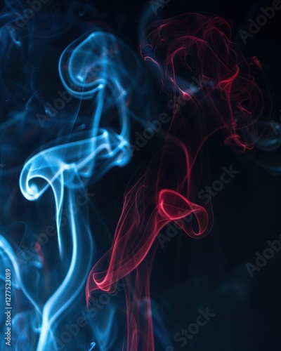 A mesmerizing swirl of blue and red smoke intertwines, creating an ethereal visual effect against a dark background.