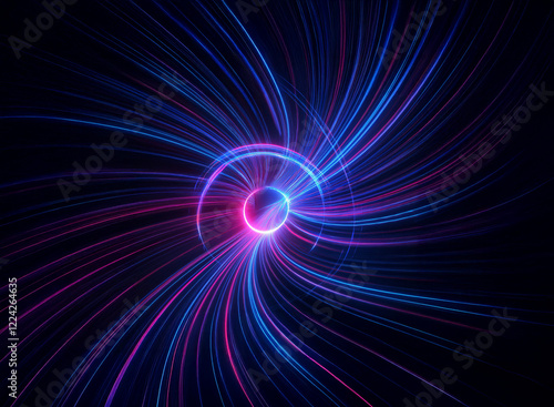 A mesmerizing swirl of vibrant blue and pink light streaks emanate from a central glowing core, creating a dynamic, energetic abstract composition.