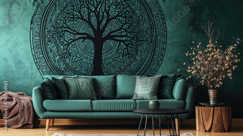 a mesmerizing tree mandala pattern on a serene, solid-colored wall background with a cozy sofa.