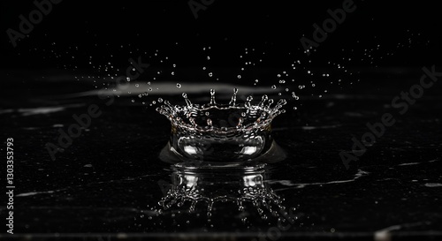 A mesmerizing, ultra-realistic close-up of a crystal-clear water droplet splashing onto a smooth black marble surface