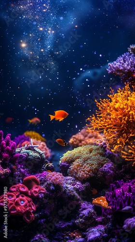A mesmerizing underwater scene showcasing vibrant coral reefs illuminated by ethereal starlight