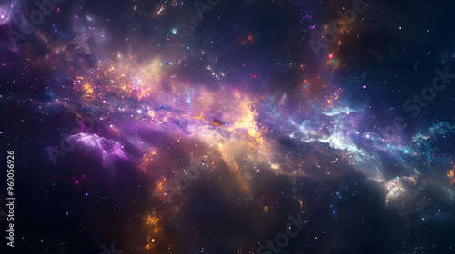A mesmerizing view of a galaxy with vibrant purples, blues, and oranges stretching across the cosmos, showcasing the beauty and vastness of the universe.