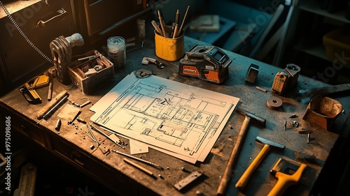 A messy workbench with tools and a blueprint, showcasing a carpenter's workspace.