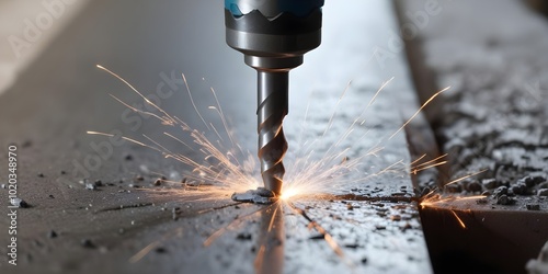 A metal drill bit drilling into a surface , creating smoke and shavings