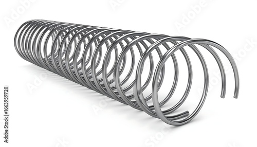 A metallic coil spring, long and slender, extends diagonally across a white background