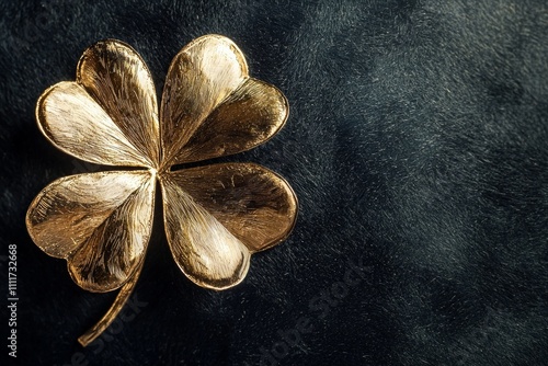 A metallic gold four-leaf clover on a black velvet background with soft spotlighting