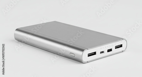 A metallic gray portable charging device with rounded ends and multiple USB ports sits on a white surface