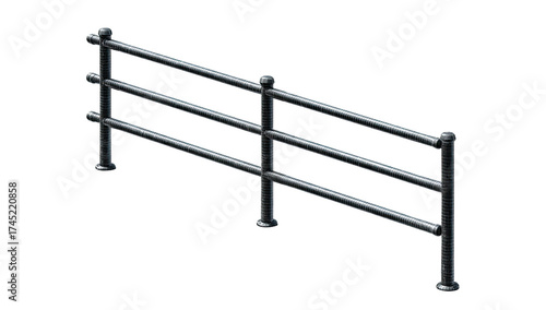 A metallic, stylized three-railed fence, with rounded posts and horizontal bars, against a black backdrop