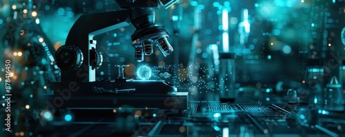 A microscope is shown with a glowing object inside of it. The image has a futuristic and scientific feel to it