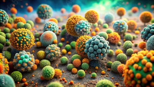A microscopic view of a diverse collection of spherical microorganisms, showcasing intricate textures and vibrant colors