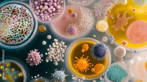 A microscopic view of bacteria, viruses, and fungi, showing the diversity of microorganisms in a petri dish.