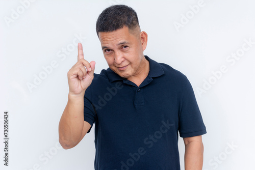 A middle-aged Asian man in a dark polo shirt gestures upwards with a reminder to participate in voting. Portrait shot on a white background.