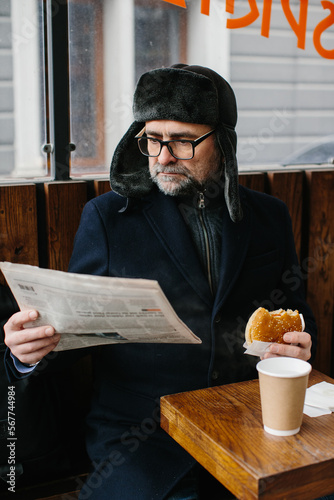A middle-aged bearded man eats a tasty burger and reads today's newspaper on a city street in winter. Street food concept.