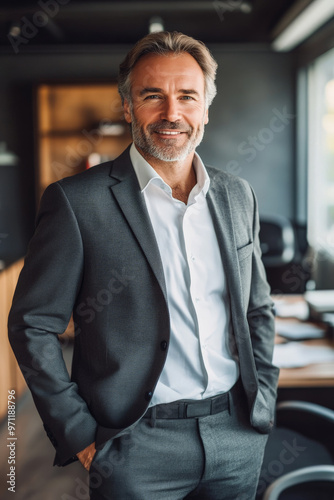 A middle-aged Caucasian businessman, with a warm and assured smile, stands in a contemporary office. He is dressed in a tailored suit, and the backdrop includes a well-organized desk and sophisticated