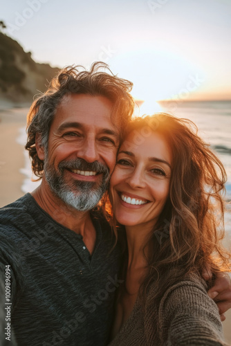 A middle-aged Caucasian couple captures a cheerful selfie on a picturesque beach, their smiles radiating joy as the sun sets behind them, creating a romantic top model atmosphere.
