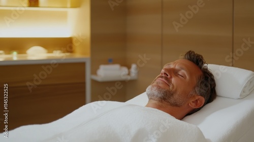A middle-aged Caucasian man lies face-down on a massage table exuding tranquility with a gentle smile. The minimalist spa features warm lighting and a calming atmosphere perfect for relaxation