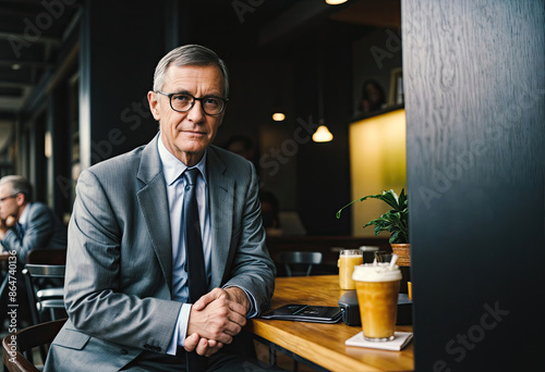 A middle-aged man in glasses and a gray suit, sitting at a cafe table