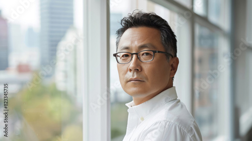 A middle-aged man in glasses and a white shirt is standing by the window of an office building, overlooking the cityscape outside.
