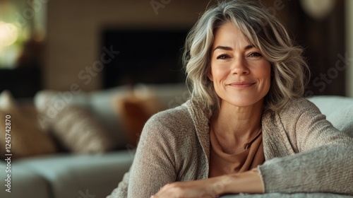 A middle-aged woman sits comfortably in a living room, looking directly at the camera with a warm smile on her face.