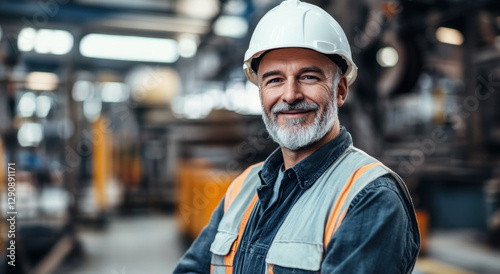 A middle-aged worker wearing a hard hat and safety vest is smiling in an industrial setting filled with machinery and equipment