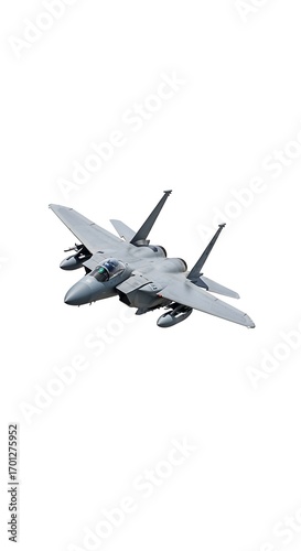 A military jet aircraft in flight against a plain white background, showcasing its aerodynamic design and neutral gray color scheme.
