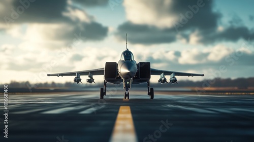 A military jet positioned on an airstrip under a dramatic sky.
