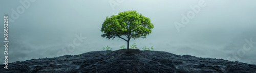 A miniature bonsai tree exhibits ethereal beauty as it seemingly floats atop a rugged, craggy plateau against a clear backdrop.