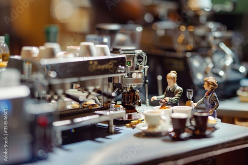 A miniature coffee setup featuring espresso machines and tiny figures enjoying drinks.