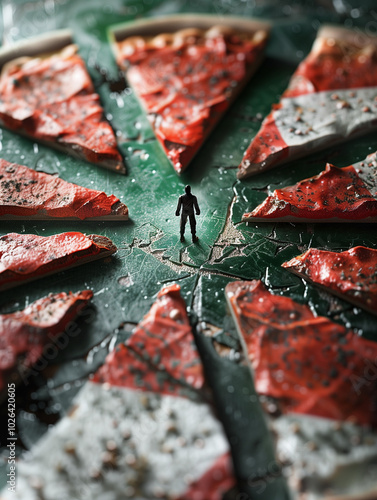A miniature figure stands between oversized pizza slices, creating a surreal food landscape concept