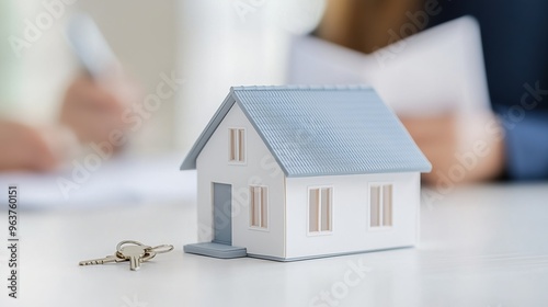 A miniature house model and a set of keys on a table, with people in the background signing documents, symbolizing real estate transactions.