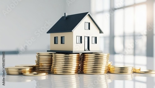 A miniature house sits atop a stack of shiny gold coins, symbolizing real estate investment and financial growth in a bright, modern setting.