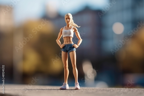 A miniature model poised confidently on pavement with a blurred city backdrop