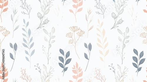 A minimal botany pattern, delicate leaves and flowers, evenly spaced across a clean white background