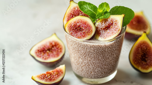 A minimal shot of chia pudding with coconut milk, sliced figs, and a drizzle of agave nectar, set on a clean white surface with soft light, concept of healthy eating