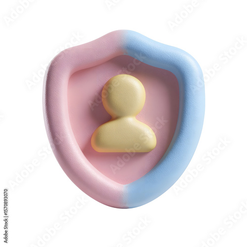 A minimalist 3D clay style icon depicting a pastel colored shield with a silhouetted person inside symbolizing the concept of user identity and security protection