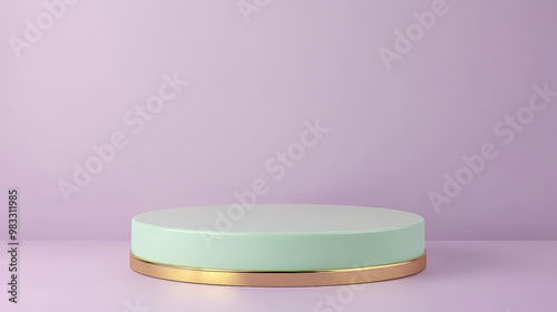 A minimalist 3D round platform in soft mint green, with a glossy gold pedestal, set on a pastel lavender background for modern product display.