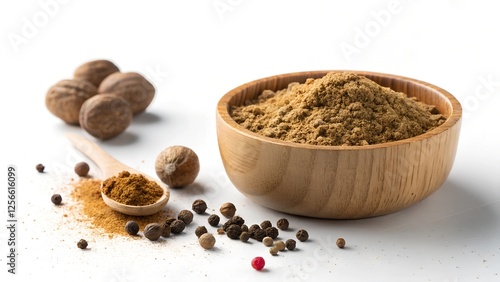 A Minimalist 4K Image of Ground and Whole Spices in a Wooden Bowl on a Pure White Background with Space for Labeling