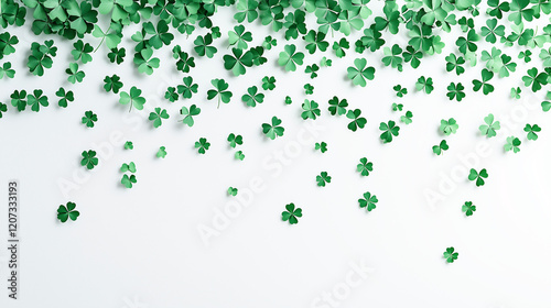 A minimalist abstract design of green shamrocks falling like rain against a white background