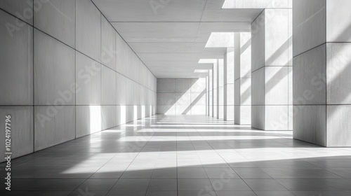 A minimalist architectural space with light and shadow play on concrete surfaces.