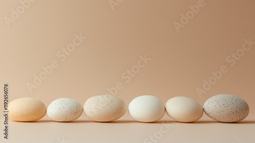 A minimalist arrangement of six stones in varying shades of cream and beige, displayed against a soft, neutral background