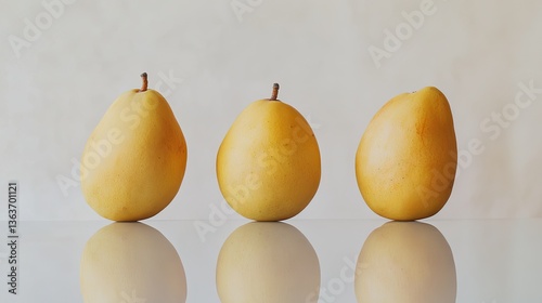 A minimalist arrangement of three whole ripe mangoes in different shades of golden yellow