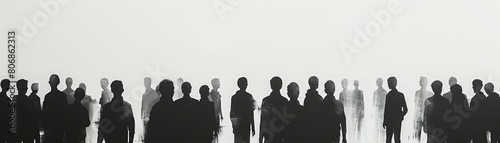 A minimalist black and white illustration showing a dense array of silhouettes, each figure distinct yet part of a larger pattern of human shapes, symbolizing societys complexity