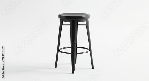 A minimalist black metal bar stool with a round seat and four legs, isolated on a clean white background.