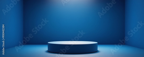 A minimalist blue podium illuminated by a spotlight on a blue background, perfect for product showcases, award ceremonies, or presentations