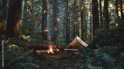 A minimalist camping setup with a single tent and a small fire in the middle of a dense forest.