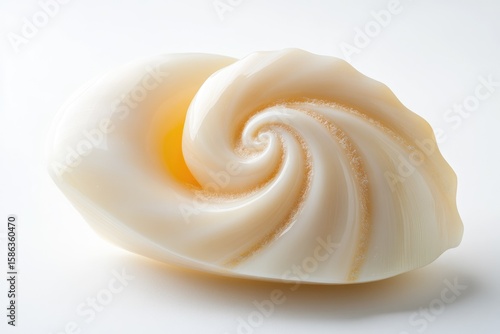 A minimalist close-up of a pearlescent, creamy-white seashell with a perfect spiral, resting on a clean white background.