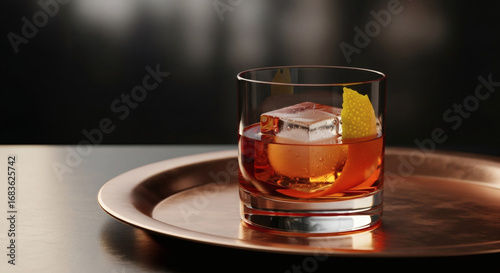 A minimalist composition of a single, perfect cocktail with a large ice cube and a twist of citrus, sitting on a copper bar tray against a dark, moody background