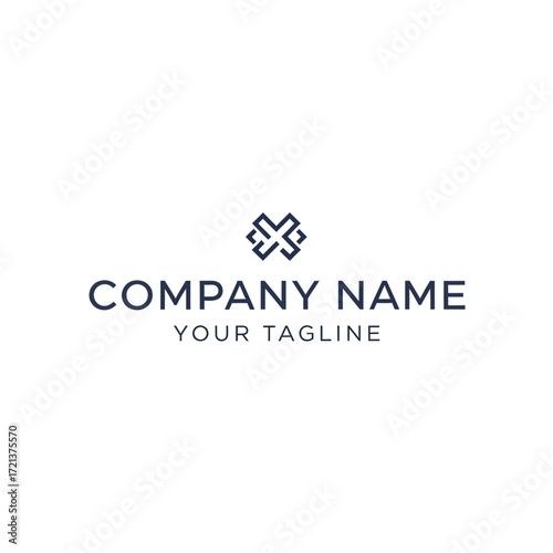A minimalist dark blue logo featuring an abstract geometric symbol above the text "COMPANY NAME" and "YOUR TAGLINE" on a white background.