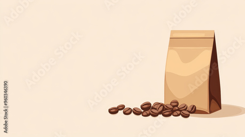 A minimalist design featuring coffee bag and scattered coffee beans evokes warm, inviting atmosphere.
