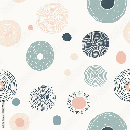 A minimalist design featuring concentric circles and random dots in soft pastel colors. The gentle shapes create a calm, inviting pattern ideal for children's bedding or wall art